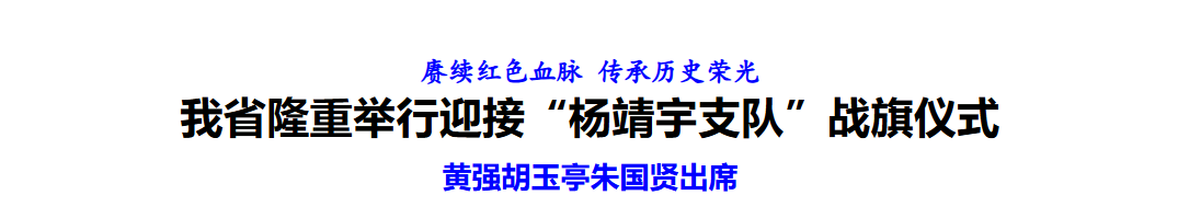 9月14日,我省在中共吉林省委机关隆重举行迎接“杨靖宇支队”战旗仪式,以最高礼遇致敬这面英雄的旗帜、胜利的旗帜、不朽的旗帜,赓续红色血脉,传承东北抗联精神,弘扬伟大抗战精神,激励全省上下牢记习近平总书记殷殷嘱托,踔厉奋发、勇毅前行,奋力推动吉林全面振兴和高质量发展。省委书记、省人大常委会主任黄强,省委副书记、省长胡玉亭,省政协主席朱国贤出席仪式。