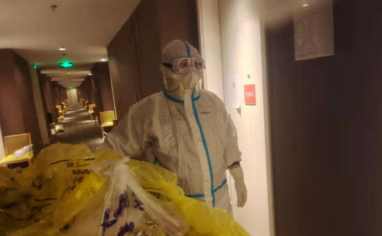 退役军人李义东原本是临江市花山镇花山村驻村“第一书记”,在疫情防控第一线,他每天带领村两委班子在村口卡点值班、卫生消杀、入户排查等工作,为全村百姓筑牢疫情防控屏障。3月14日,李义东写下请战书,主动请战支援集中隔离医学观察点。在隔离点,他作为疫情防控先锋员,每天穿着防护服在酒店房间门口清理垃圾,再背起重重的喷雾器,消毒消杀,弯腰、起来,简单的动作反反复复。患有髋关节积液的他,步履不再轻盈,但目光依然坚定。