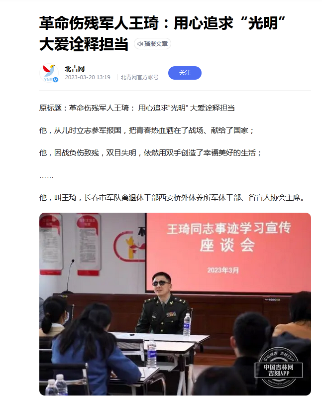 他,叫王琦,长春市军队离退休干部西安桥外休养所军休干部、省盲人协会主席。
