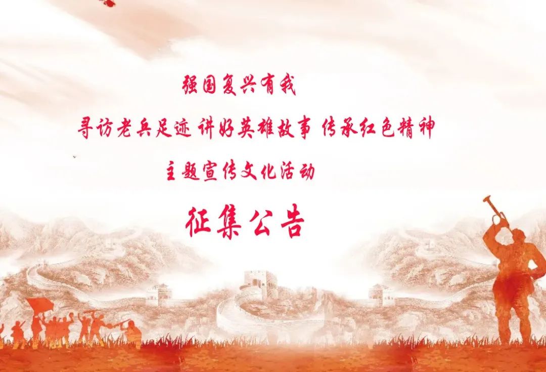 为深入学习贯彻习近平总书记“要广泛开展先进模范学习宣传活动,营造崇尚英雄、学习英雄、捍卫英雄、关爱英雄的浓厚氛围”重要指示精神,按照中共中央办公厅印发的《关于推动党史学习教育常态化长效化的意见》部署和吉林省委宣传部《关于迎接党的二十大胜利召开“强国复兴有我”群众性主题宣传教育活动的通知》要求,从5月下旬开始至10月末,吉林省部署开展“强国复兴有我·寻访老兵足迹 讲好英雄故事 传承红色精神”主题宣传文化活动(以下简称“主题宣传文化活动”)。为推动“主题宣传文化活动”有力有序开展,寻访到更多事迹突出、功勋卓越的老兵,吸引更多关注关心老兵的文艺工作者、爱好者以及社会爱心志愿团队、志愿者参与到活动中来,现向社会广泛征集老兵事迹和参与活动的文艺工作者、文艺爱好者和社会爱心志愿团队、志愿者。
