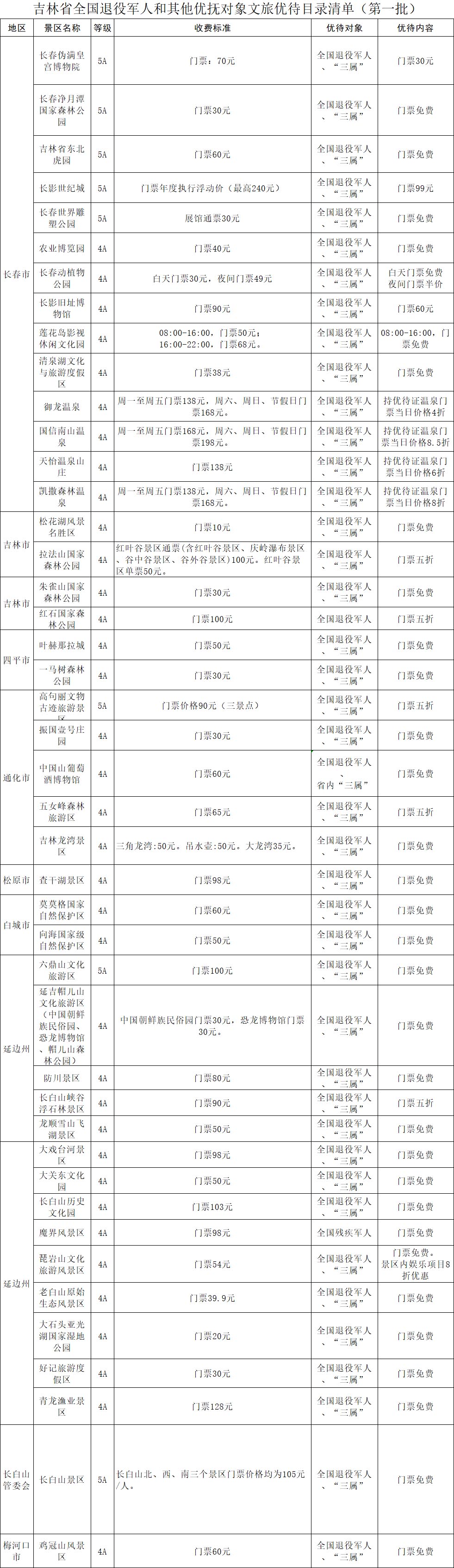 现将吉林省全国退役军人和其他优抚对象文旅优待目录清单(第一批)公布如下。