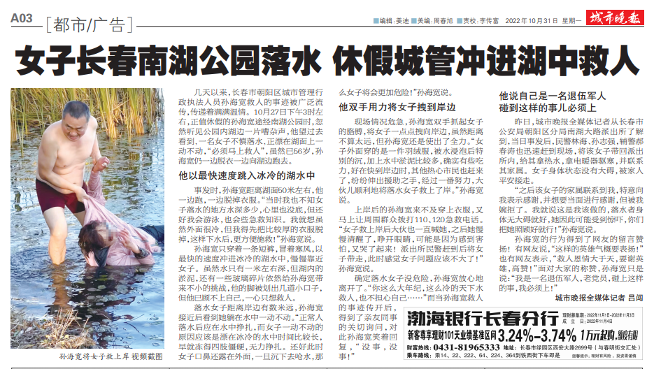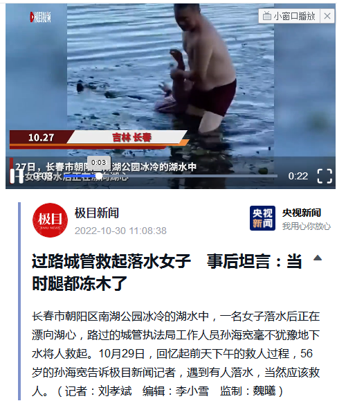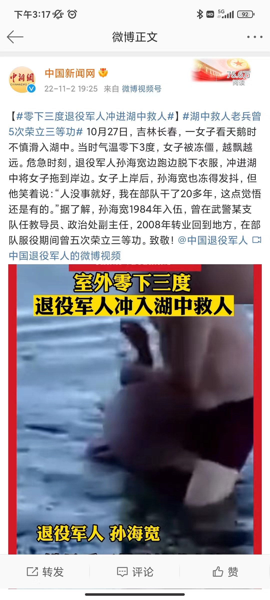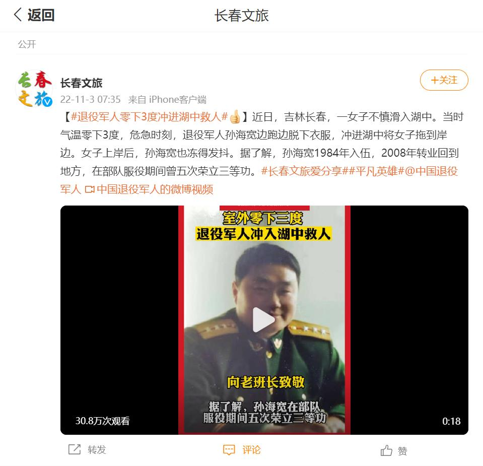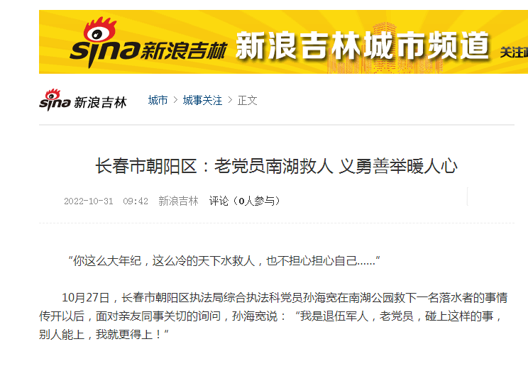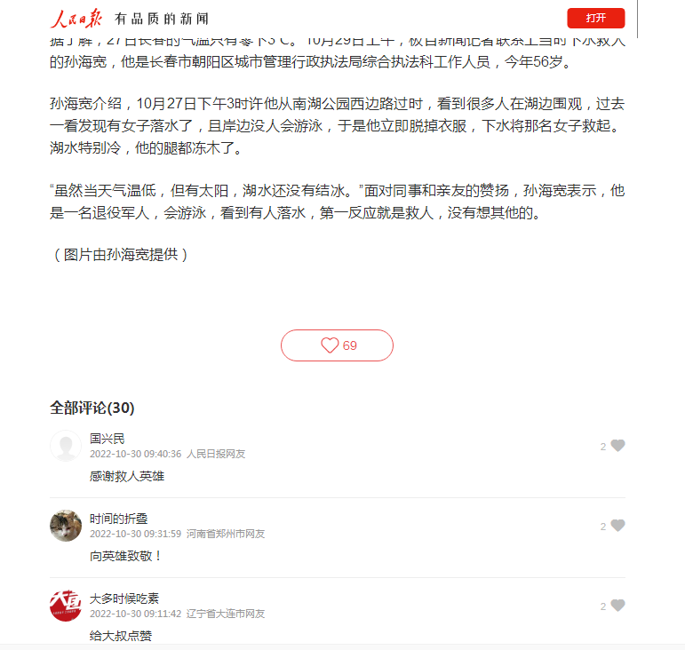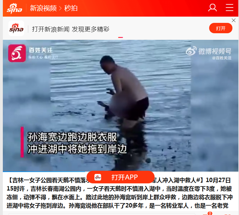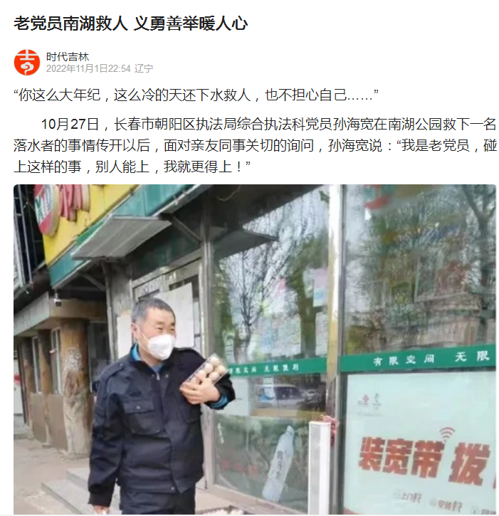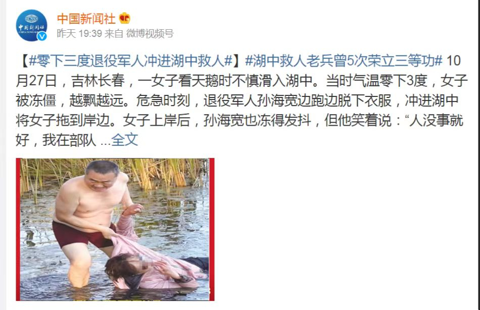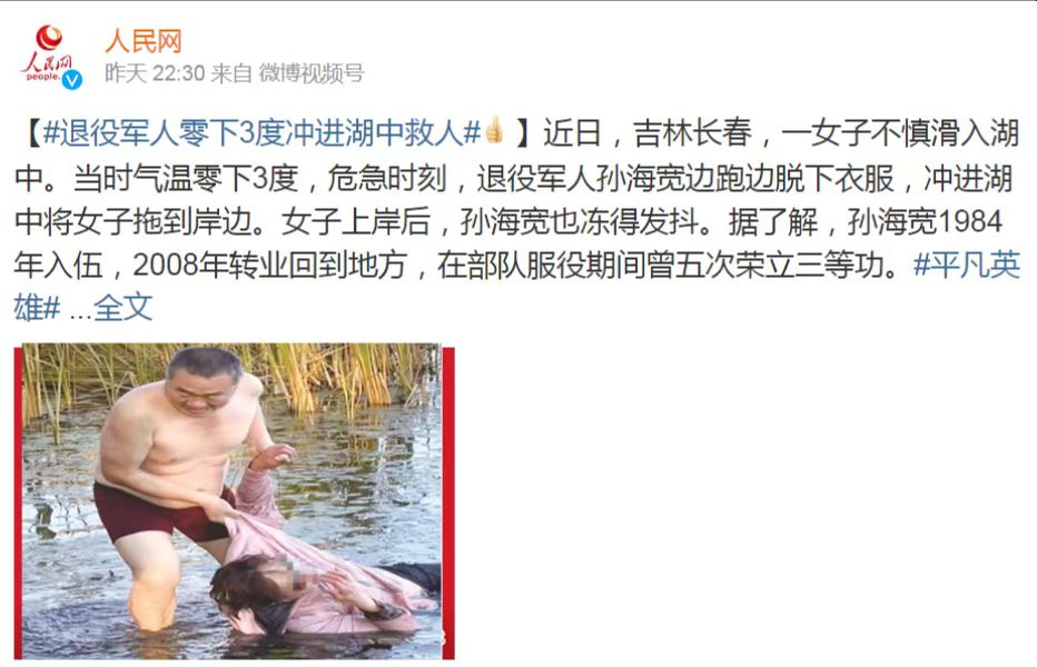 连日来,56岁退役军人孙海宽危急时刻挺身而出,冰冷湖水中勇救落水群众的事迹被媒体广泛宣传报道,引起社会广泛关注和积极反响。