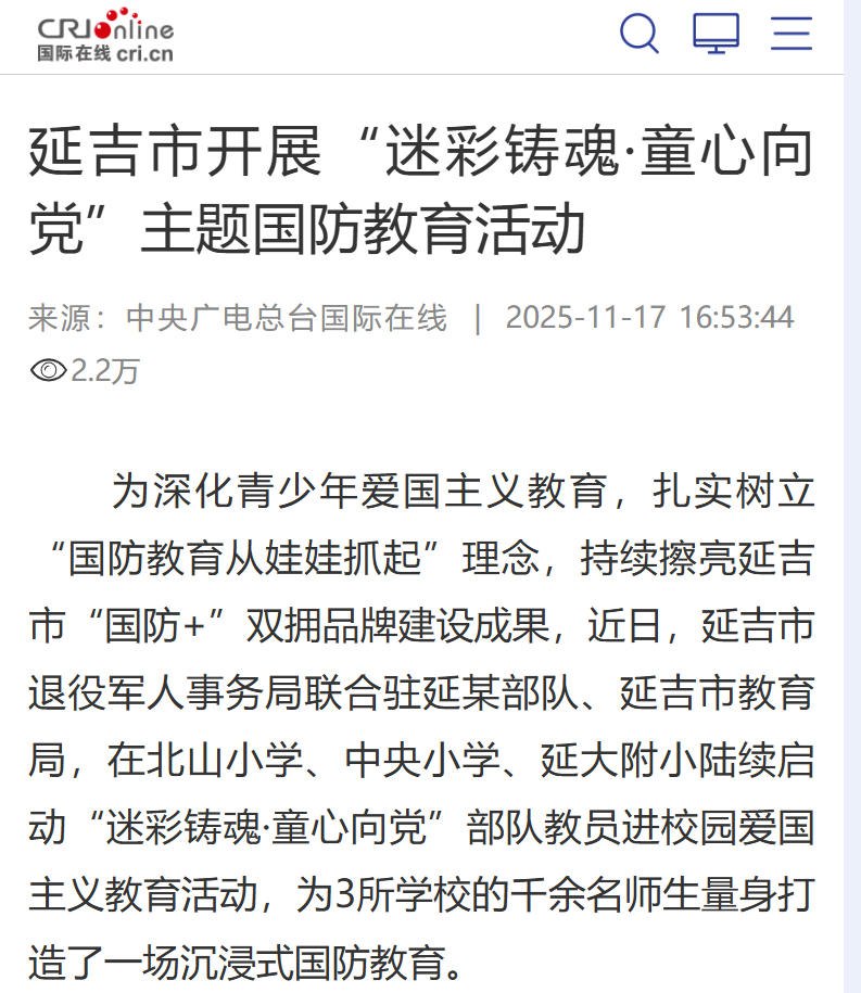 为深化青少年爱国主义教育,扎实树立“国防教育从娃娃抓起”理念,持续擦亮延吉市“国防+”双拥品牌建设成果,近日,延吉市退役军人事务局联合驻延某部队、延吉市教育局,在北山小学、中央小学、延大附小陆续启动“迷彩铸魂·童心向党”部队教员进校园爱国主义教育活动,为3所学校的千余名师生量身打造了一场沉浸式国防教育。
