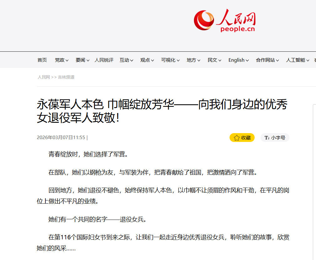 人民网3月7日刊发:永葆军人本色 巾帼绽放芳华——向我们身边的优秀女退役军人致敬!