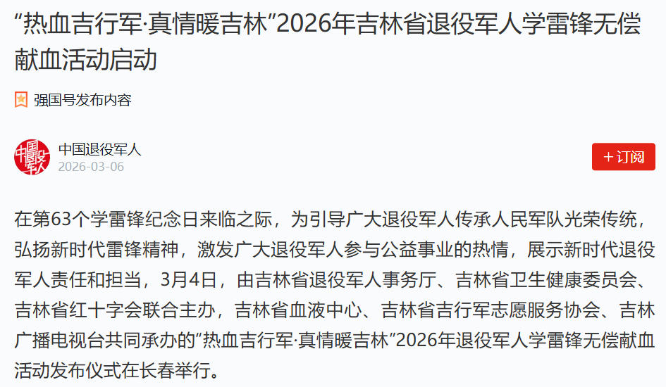 “热血吉行军·真情暖吉林”2026年退役军人学雷锋无偿献血活动分为两个阶段:3月4日至3月12日为宣传动员阶段,3月13日至3月17日为集中献血阶段。期间,全省退役军人可通过各级退役军人服务中心(站)、“吉林省吉行军志愿服务”小程序等渠道报名参与,或自行前往采血点献血。各地区将为取得《无偿献血证》的退役军人和吉行军志愿者发放专属纪念品。