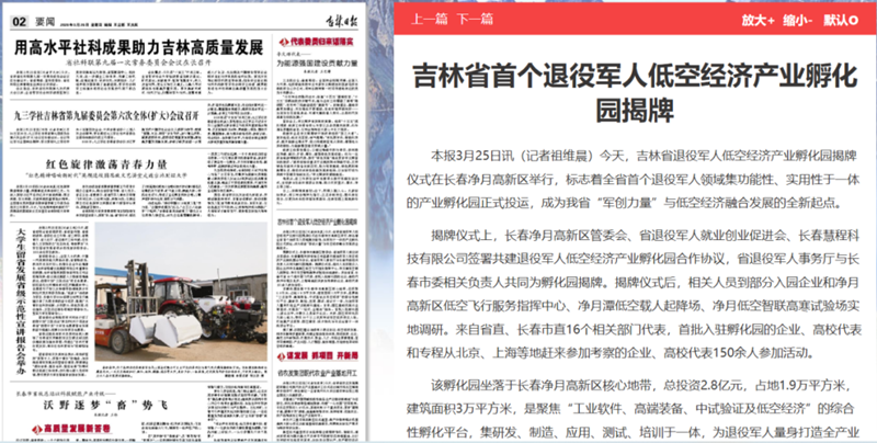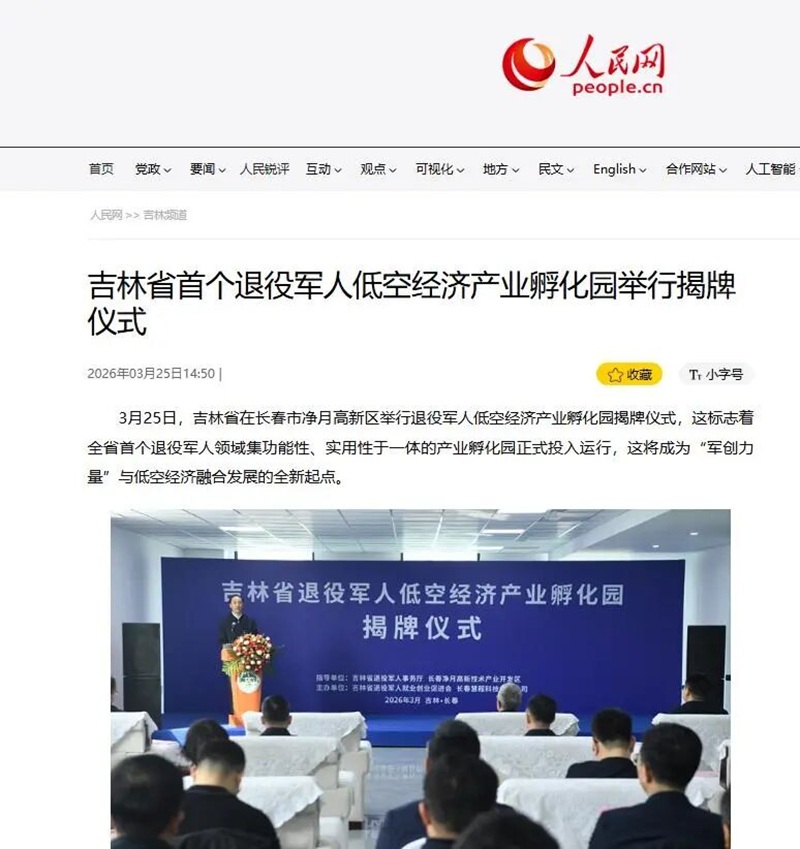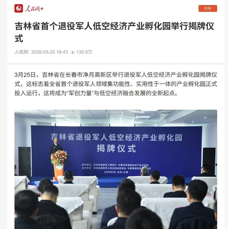 截至3月27日,人民网、新华网、新华客户端、中央广播电视总台国际在线、退役军人事务部网站、中国科技网、中国新闻网、吉林省人民政府网站、《吉林日报》、吉林广播电视台、中国吉林网和央广网、凤凰网、新浪网等20余家媒体,吉风吉韵、长春发展、长春小风、白家大伟等粉丝关注量在百万以上网络大V、自媒体博主,吉林省四川商会、吉林省江苏商会、吉林省陕西商会、政数通数据观察、共享飞机俱乐部等公众号广泛报道孵化园揭牌仪式。目前,该新闻的网络点击浏览、转评赞累计达800万次,“人民网+”浏览量达135万次,新华网客户端浏览量近96.5万次。入驻孵化园的吉林省龙翔低空科技有限公司在揭牌仪式后接到年采购2万台无人机的合作意向。全省各地退役军人创业者通过致电或公众号、评论区留言等多种方式,向省退役军人就业创业促进会咨询孵化园具体情况和入驻条件,社会各界特别是广大退役军人创业者投身低空经济产业氛围更加浓厚。