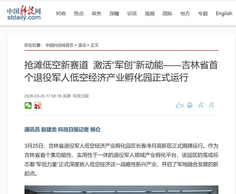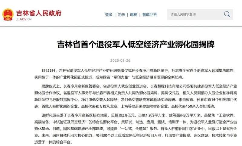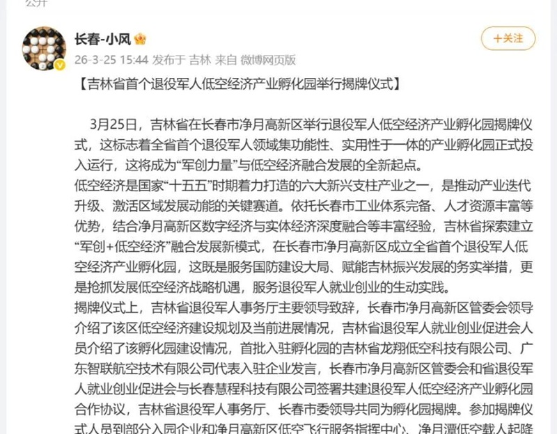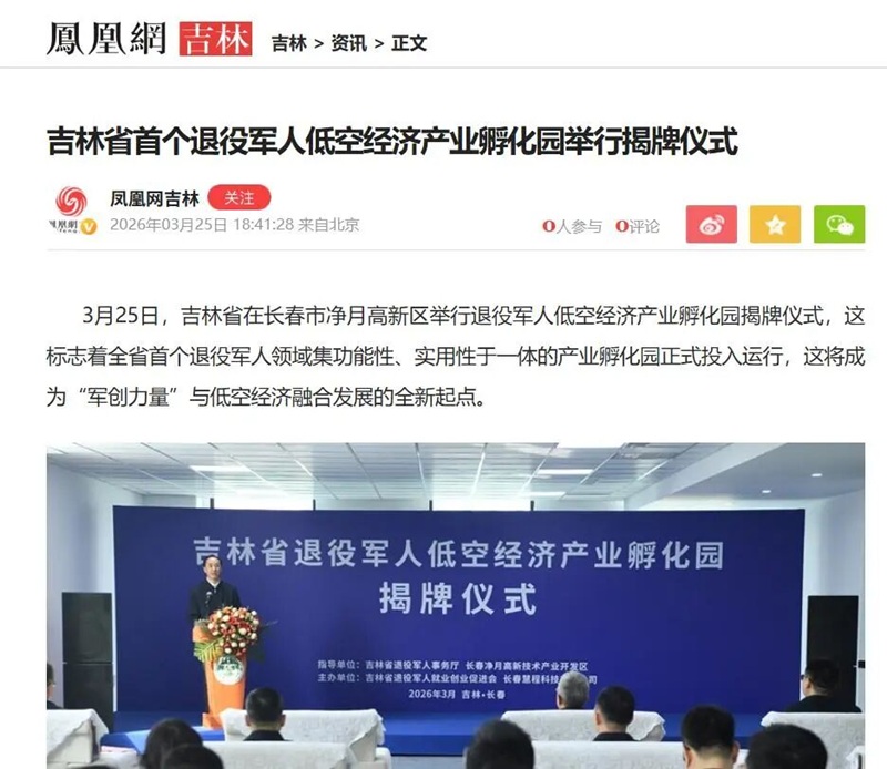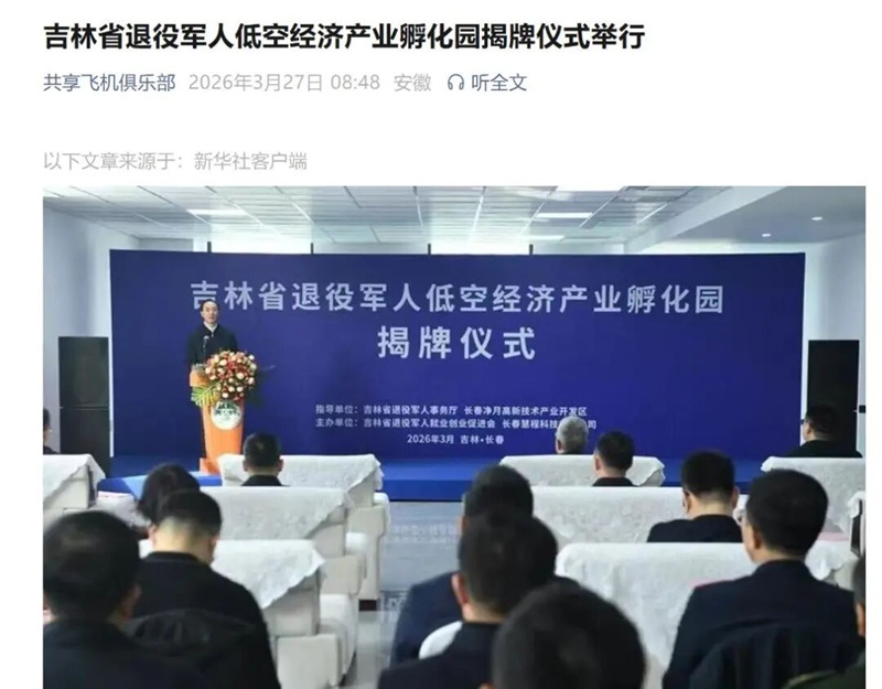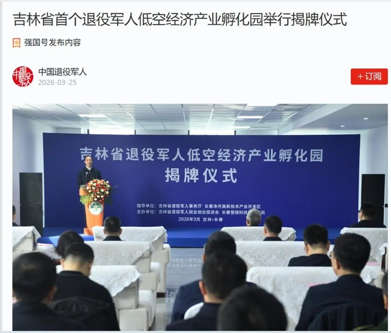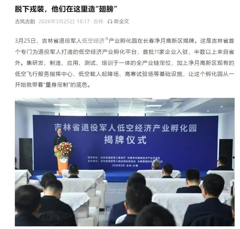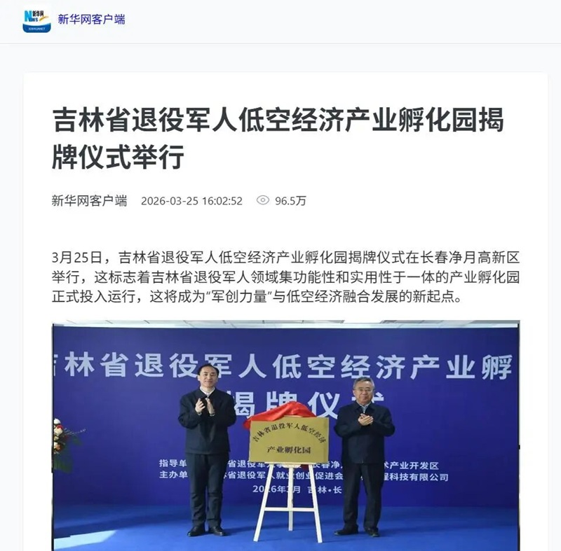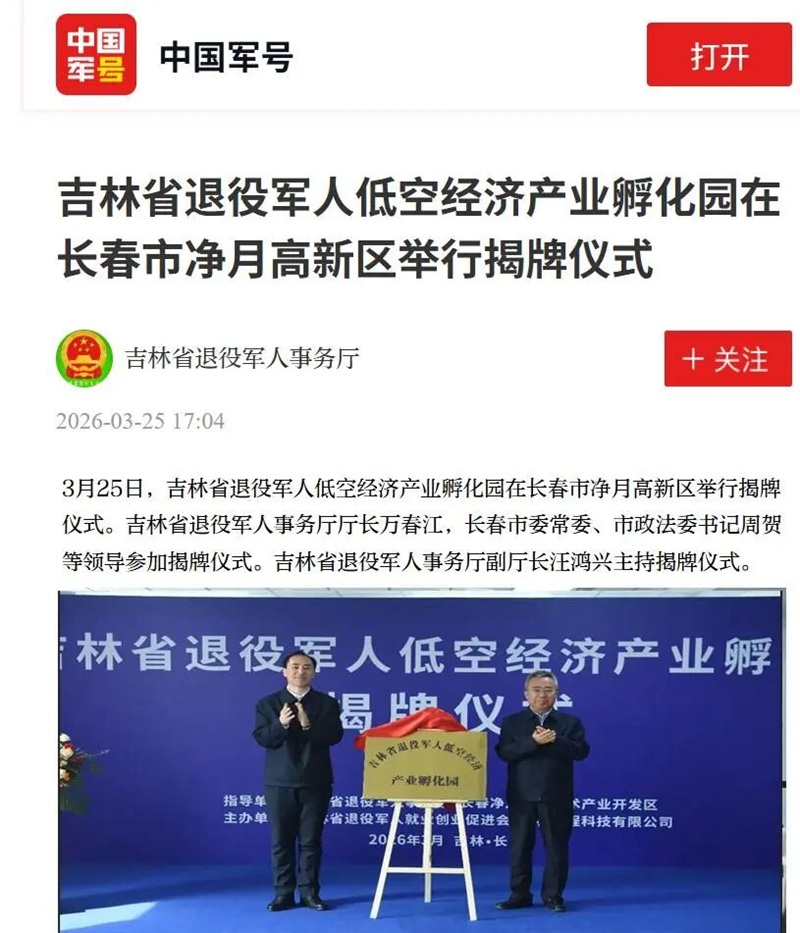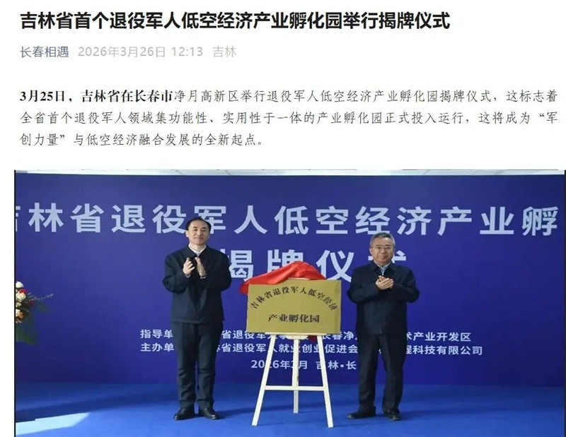 3月25日,吉林省首个退役军人低空经济产业孵化园举行揭牌仪式。在低空经济成为推动产业迭代升级、激活区域发展动能的关键赛道的时代背景下,吉林省依托长春市和净月高新区低空经济发展优势和实践探索成立的全省首个退役军人低空经济产业孵化园受到媒体和社会各界广泛关注。