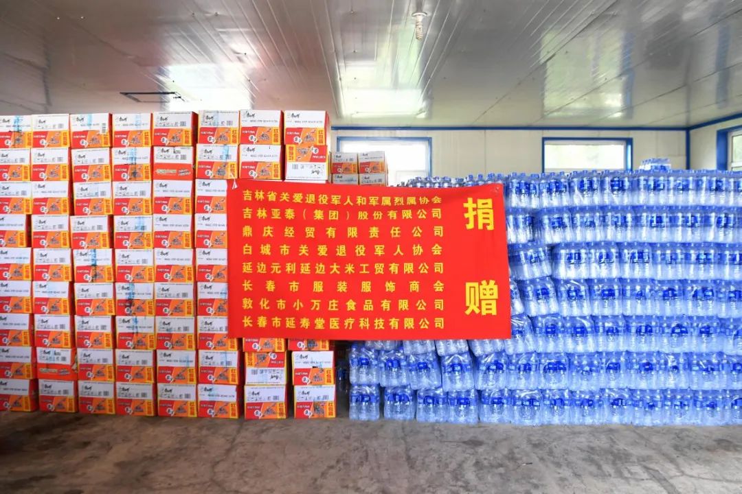 洪水无情,人间有爱。灾情发生后,在省退役军人事务厅号召下,省关爱退役军人和军属烈属协会闻“汛”而动。8月8日,省关爱退役军人和军属烈属协会发出向舒兰灾区捐赠救灾物资倡议,得到吉林亚泰(集团)股份有限公司、鼎庆经贸有限责任公司、白城市关爱退役军人协会、延边元利延边大米工贸有限公司、长春市服装服饰商会、敦化市小万庄食品有限公司、长春市延寿堂医疗科技有限公司等多家会员单位积极响应。截止8月11日,各爱心企业共向舒兰市捐赠包括矿泉水1400箱、方便面850箱、火腿肠60箱、一次性碗筷240袋、大米50袋、煎饼20箱、咸菜30箱、衣服1500件等在内的价值25万余元的生活物资,帮助当地受灾的群众渡过难关。