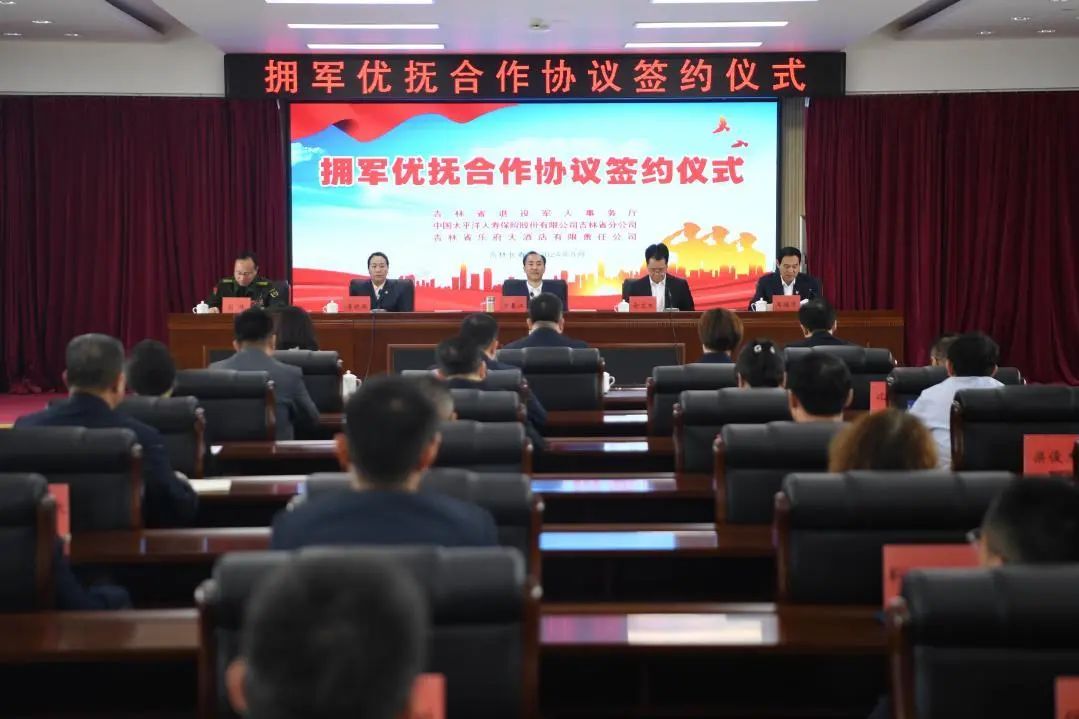吉林省退役军人事务厅副厅长王继才主持签约仪式。吉林省退役军人事务厅副厅长、吉林省军区政治工作局大校副主任刘伟与中国太平洋人寿保险股份有限公司吉林省分公司副总经理贾素梅、吉林省乐府大酒店有限责任公司总经理助理刘新刚,分别签署拥军优抚合作协议。中国太平洋人寿保险股份有限公司北区副总经理佘文生、吉林省乐府大酒店有限责任公司党总支副书记李晓微在签约仪式上分别致辞,两家企业表示,将在人寿保险服务、入住酒店、承办会议等方面为退役军人和其他优抚对象提供优待优惠。