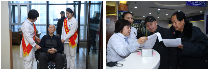 长春市中心医院工作人员为参加体检老兵一对一服务。