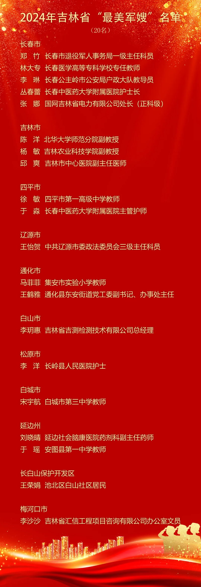 年初,4部门联合下发《关于做好2024年吉林省“最美军嫂”寻找推荐工作的通知》,对“最美军嫂”寻找推荐工作进行部署。各地各部门依照推选条件广泛寻找、逐级推荐。经严格筛选、优中选优,对候选人经审核、公示等环节后,确定20名“最美军嫂”人选。