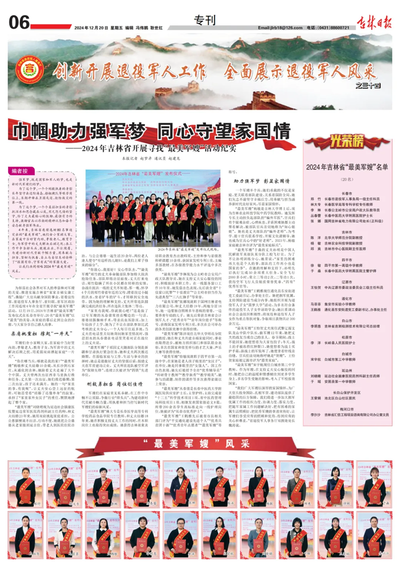 年初,4部门联合下发《关于做好2024年吉林省“最美军嫂”寻找推荐工作的通知》,对“最美军嫂”寻找推荐工作进行部署。各地各部门依照推选条件广泛寻找、逐级推荐。经严格筛选、优中选优,对候选人经审核、公示等环节后,确定20名“最美军嫂”人选。